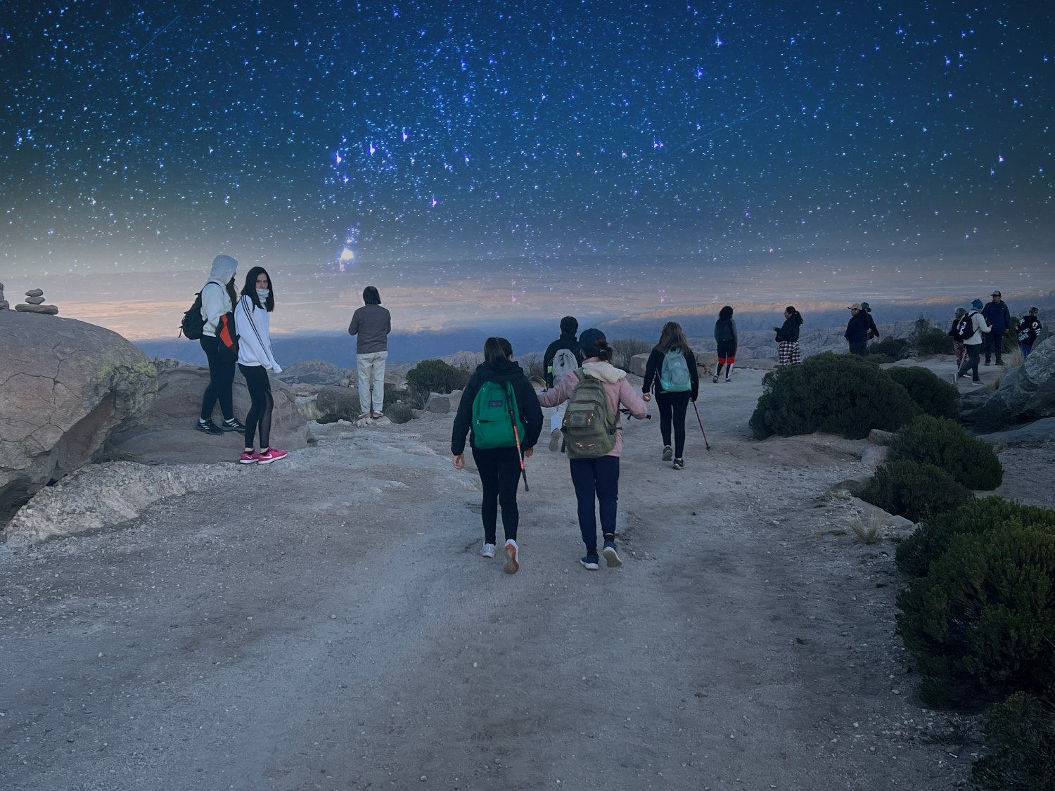 -Se recomienda llevar ropa y calzado cómodo, abrigo liviano, linterna, bastón de trekking, comida liviana, barra de cereal, frutas (manzana, banana, otras) y botella de agua o bebida isotónica.
